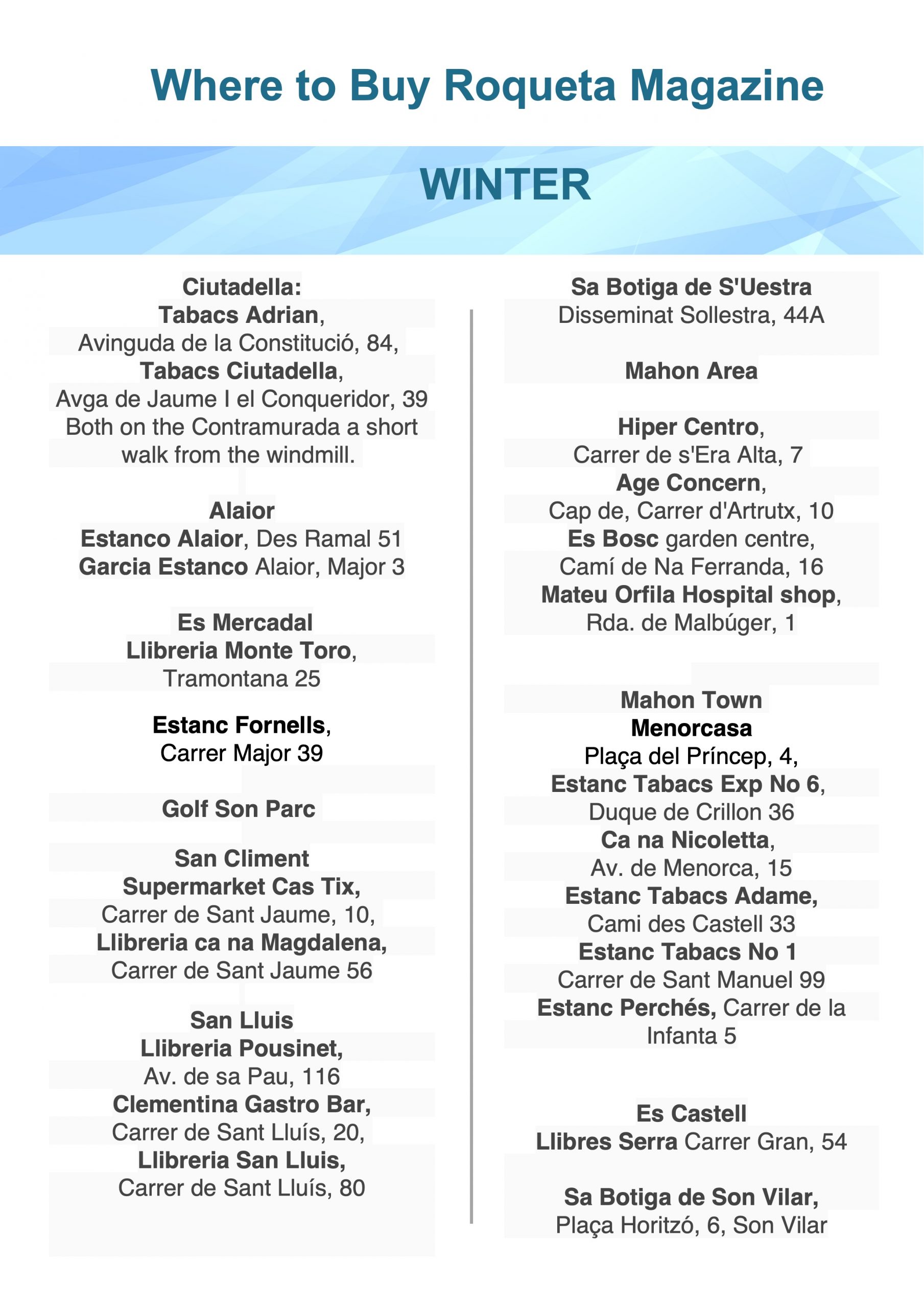 A list of outlets for Summer and Winter editions of Roqueta Magazine (click on images to enlarge) or download as PDF here »